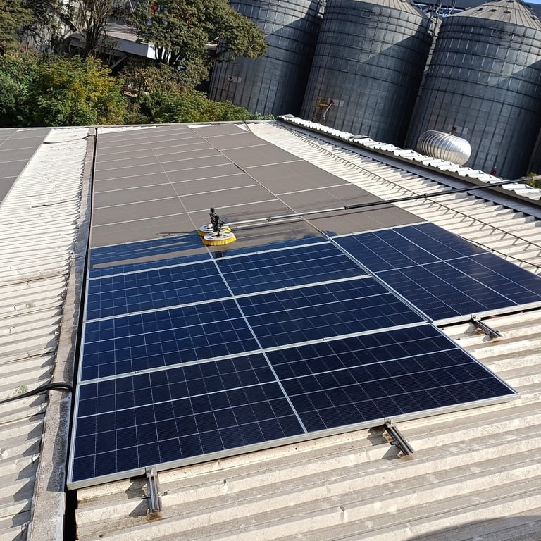 A limpeza é uma etapa essencial da manutenção preventiva e deve ser feita com água limpa e equipamentos não abrasivos, como vassouras de cerdas macias, rodos com pano úmido ou esponjas apropriadas. O objetivo é remover sujeiras sem danificar o vidro dos módulos.